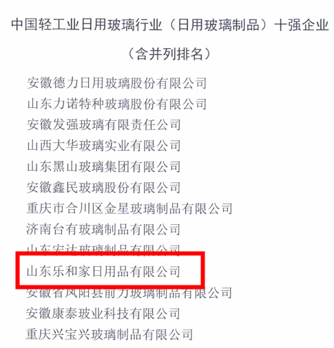 不忘初心 | 樂和家榮獲中國中國輕工業日用玻璃行業 (日用玻璃制品) 十強企業